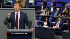 Baumann hat seine Partei im Bundestag gegen Vorwürfe der Vetternwirtschaft verteidigt. Der AfD-Politiker lobte seine Fraktion dabei ausdrücklich. Es kam zu zahlreichen Zwischenrufen und lautem Gelächter.