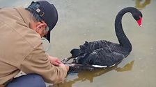 Passanten in der chinesischen Provinz Yunnan entdeckten auf einem See einen schwarzen Schwan, der sich in einer Angelleine verheddert hatte. Mit einem Trick lockten die Männer den Vogel ans Ufer.