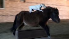 Francesca Carsen besitzt den 12-jährigen Jack Russell, Dally, und ein 17-jähriges Miniaturpferd, Spanky. Francesca war überrascht, als sie sah, dass Dally auf Spankys Rücken gestiegen war, und jetzt üben sie gemeinsam das Springreiten.