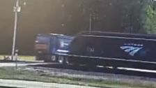 Ein Müllwagen überquert einen Bahnübergang, als er plötzlich von einem herannahenden Zug erfasst wird. Es gab weder Schranken noch Warnschilder.