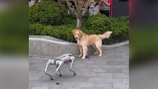 Golden Retriever flüchtet vor Roboterhund ins Gebüsch