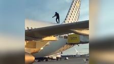 Kuriose Szenen am Flughafen im spanischen Valencia: Ein junger Mann turnt auf dem Dach eines Airbus A320 herum.