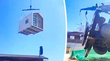 Ein Kranführer aus Khon Kaen in Thailand wollte ein Fertighaus in einem Wohngebiet platzieren und hob die Last über ein Wohnhaus. Dann schlug die Physik zu.
