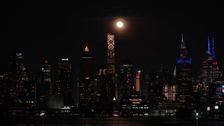 USA: Fast voller Mond steigt über der Skyline von New York City