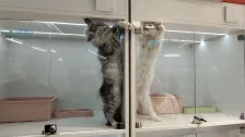 Ein Paar schelmischer Katzen wurde dabei erwischt, wie sie sich gegenseitig durch separate Gehege schlugen und stießen. Das Video, das in Shanghai, Ostchina, am 31. Mai 2025 aufgenommen wurde, zeigt die beiden Katzen, wie sie ihre Pfoten durch kleine Lücken im Glas strecken. Trotz der Trennung schienen die pelzigen Rivalen fest entschlossen zu sein, das Spielkampf weiterzuführen.