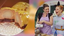 Saftiger Brownie trifft auf Schoko-Mürbteig und Kakao-Kern. Das Finish bildet die Mirror Glaze. Hobby-Bäcker Christian fragt sich, ob seine Glaze die richtige Farbe hat - oder ist sie eher Mango? Spiegelt sich hier der Sieg oder der letzte Fehler?