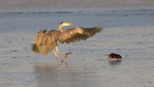 Ein Reiher war auf einem zugefrorenen See im englischen East Riding of Yorkshire einer Wühlmaus auf den Fersen. Dann wurde der Vogel jedoch von der eisglatten Oberfläche überrascht.