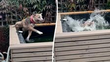 Eine Hündin namens Lady, eine Mischung aus Staffy und Englischer Bulldogge, sprang wiederholt in den Pool ihrer Familie im Südosten Londons, England, obwohl sie von ihren Besitzern hinausgetragen wurde. Die neu adoptierte Hündin, die erst seit zwei Wochen bei der Familie ist, überraschte sie mit ihren hohen Sprüngen und ihrer Liebe zum Wasser.