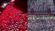 Millionen von Autofahrern fuhren nach dem chinesischen Nationalfeiertag und dem Mittherbstfest nach Hause – und verursachten damit einen der schlimmsten Staus der Welt. Videoaufnahmen vom 12. Oktober zeigen eine endlose Autoschlange, die sich dicht gedrängt in der Nähe der 36-spurigen Mautstation Wu Zhuang erstreckt.