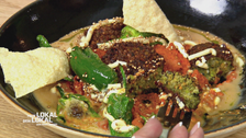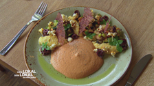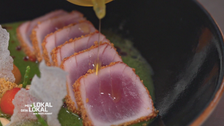 Murat ist der Erste in der Küche bei Adrian. Es gibt grüne Gazpacho. Damit diese ganz fein wird, wird sie mittels eines Tuches gesiebt. Währendessen geht es mit dem Thunfisch in Nacho-Crunch-Panade weiter. Murat ist positiv überrascht, was sagt der Rest?