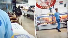 In Ibiá in Brasilien drehte ein ausgebrochener Bulle in einem Supermarkt den Spieß um: Das wütende Rind jagte an der Fleischtheke einem Metzger hinterher, zum Glück konnten sich alle Angestellten rechtzeitig in Sicherheit bringen.