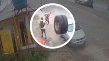 Schreckenerregende Momente filmte eine Überwachungskamera Ende Oktober in der brasilianischen Stadt Alagoinhas. Ein loser Lkw-Reifen schoss plötzlich auf einen ahnungslosen Fußgänger zu. Wie durch ein Wunder verfehlte das Geschoss den Kopf des Mannes um Zentimeter.