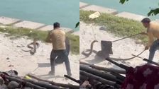 Retter packen eine 15 Fuß lange Königskobra in einen Sack, nachdem sie am Flussufer gesichtet wurde