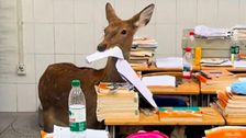 Ungewöhnlicher Besuch in einer Schule in der chinesischen Provinz Sichuan: Ein zahmes Reh, das als Schulmaskottchen gehalten wird, spazierte seelenruhig ins Klassenzimmer – und machte sich prompt über die Prüfungsblätter her.