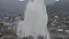 In der russischen Stadt Noworossijsk sprudelt ein meterhoher Geysir mitten aus der Straße. Er überragt umstehende Häuser deutlich.