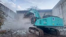 Mit einem 90-Tonnen-Bagger wird das Versorgungsgebäuden der ehemaligen Papierfabrik Albbruck Stück für Stück abgerissen.