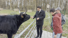 Im Wild- und Freizeitpark Höllohe in Teublitz im Landkreis Schwandorf gibt es eine neue Attraktion. Drei Auerochsen, eine Kuh und zwei Färsen, sind dort in ein etwa zwei Hektar großes Gehege gezogen. Thomas Ebeling, Landrat des Landkreises Schwandorf, ist vor Ort.