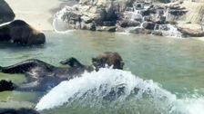 Bären spielen im Wasser, während die Winterruhe im Oakland Zoo näher rückt