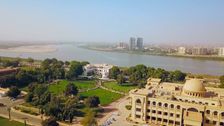 Erleben Sie die weitläufige Landschaft von Khartum, der historischen Hauptstadt des Sudan, die am legendären Zusammenfluss von Weißem und Blauem Nil liegt. Die Drohne fängt die geografische Bedeutung der Stadt als wichtigen afrikanischen Verkehrsknotenpunkt ein und folgt den Flussufern, die seit Jahrtausenden Zivilisationen ernährt haben.