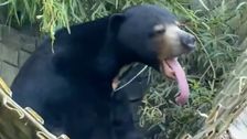 Der Malaienbär Pagi gähnt, streckt seine lange Zunge heraus und reckt seine Arme, während er sich in einer Hängematte im Oakland Zoo in Kalifornien, USA, ausruht. Der Zoo teilte den kurzen Moment im Rahmen seiner routinemäßigen Tierpflege-Updates mit.