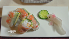 Meik erhält in Huongs Küche eine Schritt-für-Schritt-Anleitung für Sommerrollen mit Hähnchen und Garnelen. So gut hat er sie noch nie selbst zubereitet. Zusätzlich darf er den kunstvoll aus Rettich geschnitzten Fisch bewundern.
