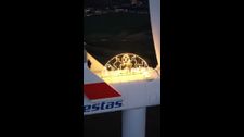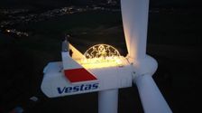 Nicht im Fenster, sondern hoch oben auf einem Windrad leuchtet ein Schwibbogen über den Feldern. Erzgebirgische Weihnacht – diesmal in himmlischer Höhe.