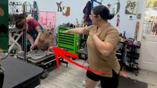 Schräge Tanzeinlage: Hundefriseurin lenkt Hund beim Nägelschneiden ab