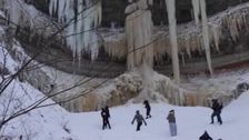Eine Gruppe Touristen entkommt nur knapp, als ein gefrorener Wasserfall in Estland plötzlich abbricht. Eisblöcke stürzen herab.