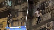 Kind baumelt vier Stockwerke über der Erde bevor es heldenhaft gerettet wird