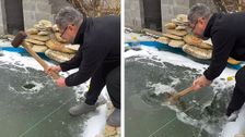 Teich zugefroren: Mann will seine Kois vor dem Ersticken retten – dann wird es nass