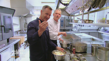 Michael bekommt als Vorspeise ein Wildrahmsüppchen mit Rehnockerl. Das Reh stammt aus eigener Jagd von Küchenchef Jürgens Bruder und Vater. Das Süppchen ist größer und gehaltvoller, als der Name vermuten lässt – wie schmeckt es Michael?