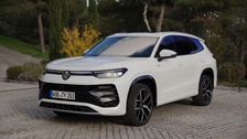 Den Heckbereich des Volkswagen SUV kennzeichnet im Heckbereich in allen Versionen eine durchgehende LED-Querspange. Weit oben ist in diese Spange ein schmaler LED-Streifen integriert, der sich von links nach rechts bis in die Rückleuchten spannt und die Breite des Tayron betont. Im mittleren Bereich wird die Querspange schmaler; die untere Hälfte des ebenfalls rot illuminierten VW-Zeichens ist deshalb nach unten hin optisch freistehend angeordnet. Die Lichtsysteme der Tayron Topversionen sind mit einer Welcome- und Goodbye-Animation ausgestattet. Der Fahrer kann dabei für die Rückleuchten unter drei verschiedenen Animationen der LEDs wählen. Über die nahezu gesamte Breite des Tayron spannt sich auch die Heckscheibe; sie wird seitlich durch die Chromelemente des „Hockeyschlägers“ eingerahmt (hochglänzendes Schwarz bei „Black Style“), die als Luftleitelemente ausgeführt sind, um die Verwirbelungen im Heckbereich zu reduzieren und damit die Aerodynamik und die Reichweite zu verbessern. Gleiches gilt für den Dachkantenspoiler über der Heckscheibe. Je nach Ausstattungsversion prägen den Tayron analog zur Frontpartie unterschiedlich konfigurierte Heckstoßfänger; alle Modelle eint jedoch ein über die komplette Breite reichender Reflektor, der stilistisch mit der LED-Querspange der Rückleuchten korrespondiert. Der Stoßfänger des Tayron Elegance wird darüber hinaus mit einer Chromspange veredelt, die optisch eigenständige „R-Line“-Version durch Elemente in hochglänzendem Schwarz. Den Abschluss bildet jeweils ein massiver, schwarz genarbter Unterfahrschutz.