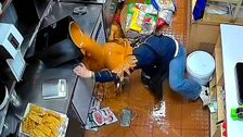 Am Arbeitsplatz sollte man am besten konzentriert vorgehen. Diese Erfahrung machte ein Restaurantmitarbeiter in der chinesischen Stadt Guangzhou. Der Mann wollte einen großen Behälter mit Soße transportieren – doch ein Ausrutscher machte alles zunichte.