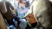Mitarbeiter guckt ruhig zu: Kämpfende Bullen zerlegen Süßigkeitenladen
