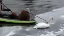 Mit Kanu und Hammer: Passanten befreien festgefrorenen Schwan