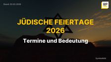 Was bedeuten die verschiedenen Feiertage und Feste im Judentum? Hier stellen wir nicht nur die wichtigen jüdischen Feste vor, sondern auch Informationen zur Bedeutung. An folgenden Daten finden die wichtigsten Feiertage statt: • Tu Bischwat: 01.02.2026 bis 02.02.2026 Es ist das jüdische Neujahrsfest der Bäume. Der Tag wird oft damit begangen, neue Bäume zu pflanzen. Es ist ein Tag des Dankes für die harmonische Beziehung zwischen Gott, dem Menschen und der Natur. • Purim: 02.03.2026 bis 03.03.2026 Das Fest Purim erinnert an die Rettung der persischen Juden. • Pessach: 01.04.2026 bis 09.04.2026 Es erinnert an die Befreiung der Israeliten aus der Sklaverei in Ägypten. • Schawuot: 21.05.2026 bis 23.05.2026 Laut Talmud wurde an Schawuot dem jüdischen Volk von Gott die Zehn Gebote am Berg Sinai verkündet. Es gilt als das jüdische Erntedankfest. • Rosch Haschana: 11.09.2026 bis 13.09.2026 Das jüdische Neujahrsfest richtet sich nach dem Mond. Es markiert den Beginn des jüdischen Jahres. • Jom Kippur: 20.09.2026 bis 21.09.2026 Jom Kippur wird als Tag der Versöhnung bezeichnet und ist ein Tag der Besinnung, der Reue und der Buße. • Sukkot: 25.09.2026 bis 02.10.2026 Es erinnert an die Wanderung der Israeliten durch die Wüste nach dem Auszug aus Ägypten und wird auch Laubhüttenfest genannt. • Schemini Azeret und Simchat Tora: 02.10.2026 bis 04.10.2026 Damit geht das Laubhüttenfest zu Ende. Die Tora und deren Gesetzgebung wird gefeiert. • Chanukka: 04.12.2026 bis 12.12.2026 Es bedeutet „Einweihung“, weil es bei der Geschichte des Festes um die Einweihung des zweiten Tempels geht. Das Fest wird auch Lichterfest genannt, weil jeden Tag eine Kerze auf dem achtarmigen Leuchter entzündet wird.