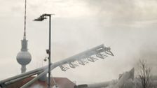 Zwei Flutlichtmasten im Friedrich-Ludwig-Jahn-Sportpark in Berlin-Prenzlauer Berg sind am Donnerstag kontrolliert gesprengt worden.