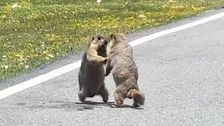 Murmeltiere, die in eine heftige Auseinandersetzung verwickelt sind, bringen den Verkehr zum Erliegen