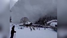 Eine Lawine kommt auf eine Gruppe Skifahrer zu, die gerade auf den Sessellift warten. Wenige Sekunden später sind sie von den Schneemassen umzingelt.
