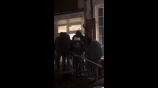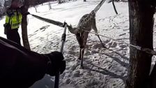 Hirsch von der Polizei gerettet, nachdem er mit dem Kopf in einer Hängematte feststeckte