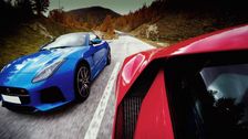 GRIP-Moderator Niki Schelle im Bergrenn-Duell gegen Matthias Malmedie. Niki jagt im Honda NSX vornweg. Während der für ihn scheinbar lockeren Fahrt kommentiert er Matthias im Jaguar F-Type SVR: "Da eiert er wirklich stark über die Vorderräder."