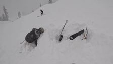 In Kalifornien steckt auf einmal ein Skifahrer im Schnee fest. Es ragen nur seine Skier raus. Zwei Männer eilen zur Hilfe und befreien ihn, damit er wieder atmen kann.