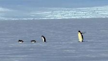 Drei Adeliepinguine spielten in der Antarktis mit dem Feuer und näherten sich einem Kaiserpinguin, der sich ausruhte. Doch plötzlich musste das freche Trio die Flucht antreten.