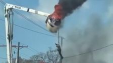 Im US-Bundesstaat Louisiana ist ein Arbeiter in eine höchst brenzlige Situation geraten. An einem Seil hängt er vom brennenden Korb eines Kranwagens.