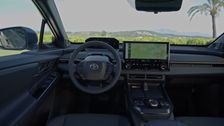 Die neu gestaltete Armaturentafel besitzt ein ultraschlankes horizontales Design, das zum offenen Raumgefühl an Bord des neuen bZ4X beiträgt. Das elegante Bauteil geht fließend in die oberen Türverkleidungen über und beherbergt zwischen der Oberseite und der unteren Polsterung neue, schlankere Lüftungsdüsen. Ein neuer 14-Zoll-Multimedia-Bildschirm ersetzt das bisherige 12,3-Zoll-Display und nimmt eine prominente zentrale Position ein. Die Mittelkonsole liegt 10 Zentimeter tiefer und bildet eine eigenständige „digitale Insel”, die einen Drehschalter für das Getriebe und zwei kabellose Smartphone-Ladegeräte für Fahrer und Beifahrer umfasst.