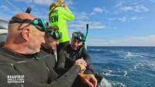 Die drei Köche wagen sich heute auf das offene Meer des Pazifiks und schwimmen mit Buckelwalen. Trotz Sicherheitsvorkehrungen bleibt die Angst vor Haien. Dennoch genießen sie den Kontakt mit den Walen.