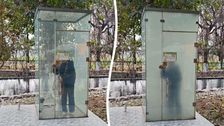 Eine öffentliche Toilette in Sichuan, China, hat Glaswände, die bei Benutzung durchscheinend werden, sodass nur noch eine schwache Silhouette sichtbar ist. Auf dem Video ist zu sehen, wie eine Frau einen Schalter betätigt, um das klare Glas in mattiertes umzuwandeln, wobei die Umrisse der Person im Inneren noch leicht erkennbar sind.