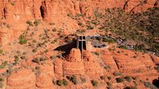 Erleben Sie die beeindruckende Architektur der Chapel of the Holy Cross in Sedona, Arizona, USA. Die Drohne umkreist die ikonische Kirche, die sich direkt aus den hoch aufragenden roten Felskuppen erhebt, und präsentiert ihr massives Betonkreuz und die raumhohen Glasfenster. Die Kamera schwenkt und enthüllt die atemberaubenden Panoramen des Coconino National Forest und die zerklüftete, purpurrote Skyline, die dieses Wüstenheiligtum zu einem spirituellen und architektonischen Wunder macht.