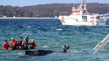 Ein junger Buckelwal steckt seit Anfang der Woche in der Lübecker Bucht fest und wird immer schwächer. Um ihn zu retten, schaufeln Bagger eine 50 Meter lange Rinne in die Ostsee.