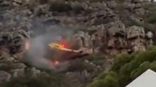Ein Löschhubschrauber kommt der Felswand zu nah. Die Rotorblätter reißen ab, er stürzt in die Tiefe.